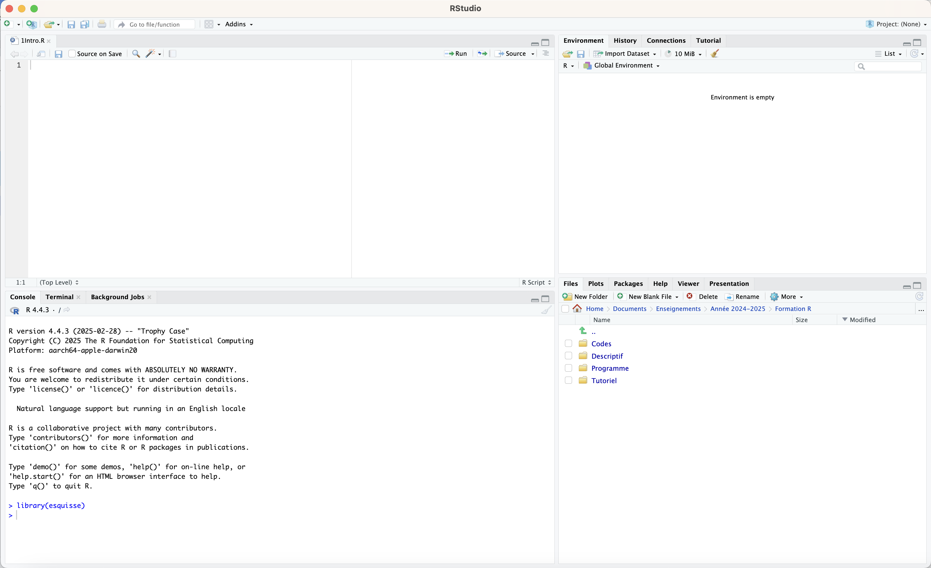 The second panel in the bottom left corresponds to the console. For now, it simply tells us that it has loaded R in the most up-to-date version found on my computer (4.4.3). The console will display the commands that we have run and the messages returned by R when executing them.