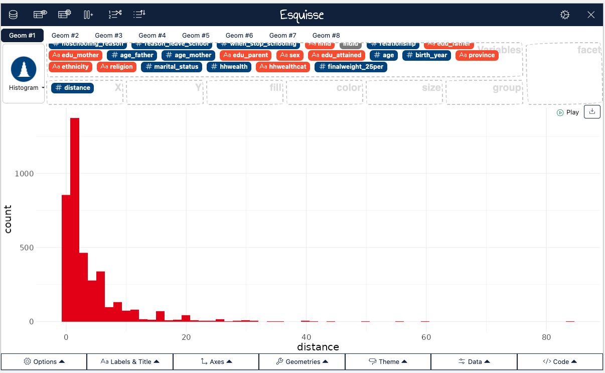 By dragging the distance variable into the X box, a histogram is created automatically. You can modify this representation, for example, by choosing a density plot instead. The entire graph is customizable using the options below.